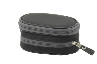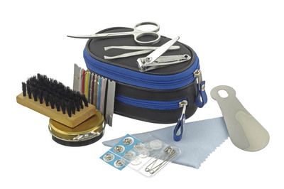 Schwarz mit farbiger Applikation, glattes Kunstleder, inklusive Schuhputzset mit Metall-Schuhlöffel, Näh- und Manikürset mit hochwertiger Schere.